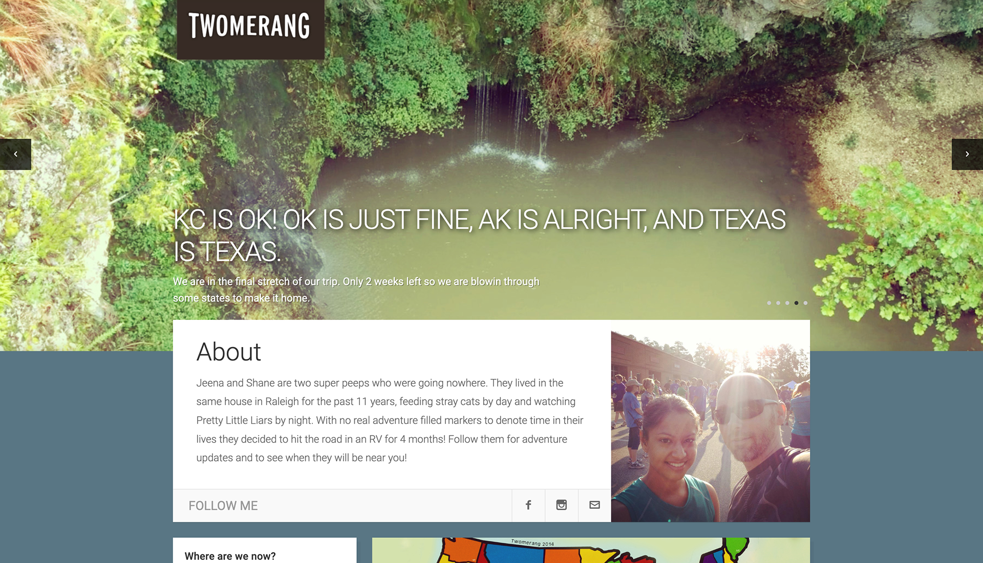 Logo and website for our 5-month RV trip to all the lower 48 states in 2015. http://twomerang.com/